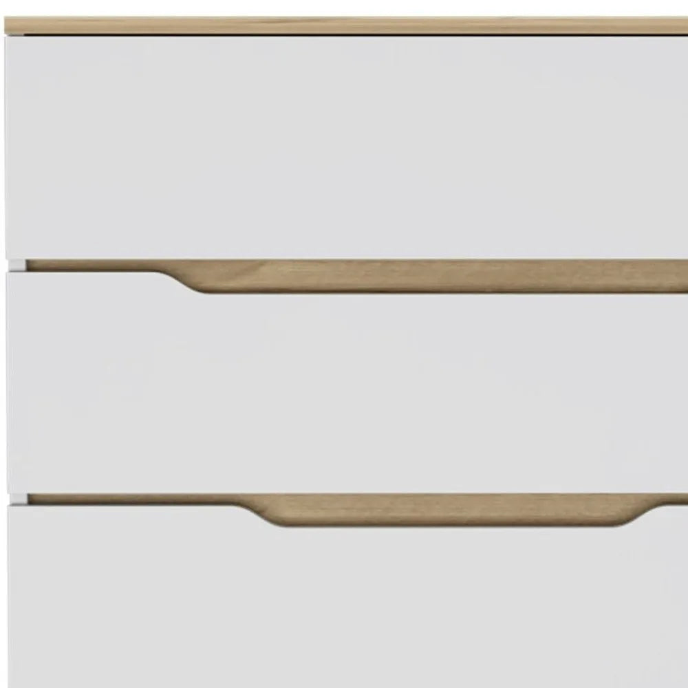 The HMS32" White and Natural Four Drawer Dresser is a stylish and functional piece of furniture designed to enhance any bedroom or living space. Crafted with a modern aesthetic, it combines white and natural tones for a fresh and versatile look.