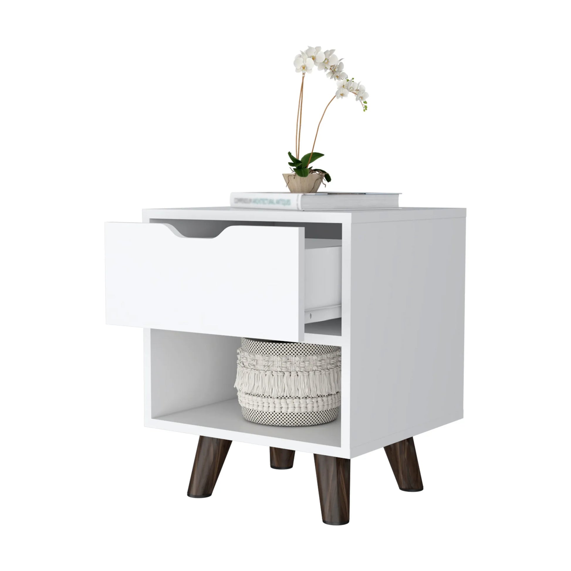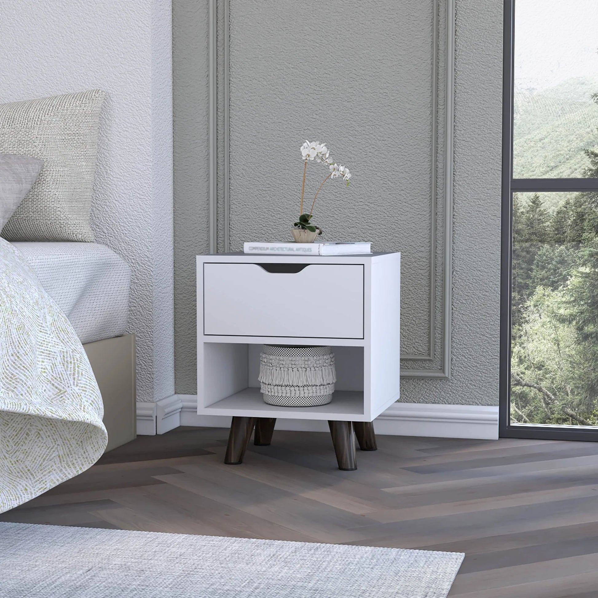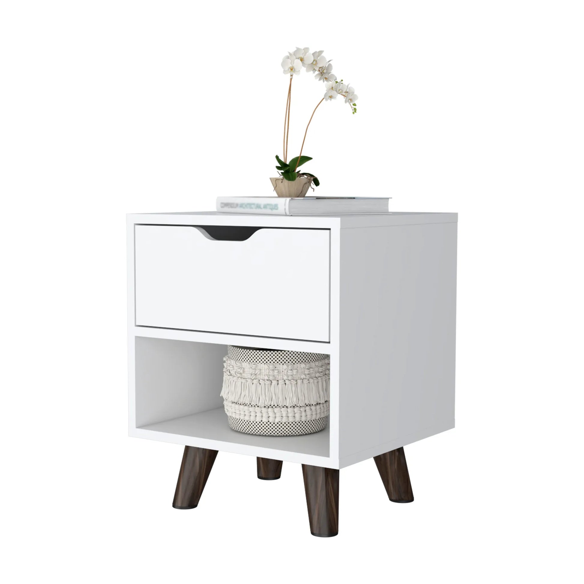 Our 19-inch white wood one drawer nightstand will compliment your bed beautifully. Sturdy and durable construction from manufactured wood ensures this trusty bedside table is built to last. Includes a drawer to help keep your essentials close by and hidden. An easy-access shelf gives you additional storage and display space. The unsung hero of the bedroom, this nightstand is perfect for keeping a glass of water, lamp, alarm clock, jewelry, and more, close by and easily accessible. Look no further than this nightstand to accommodate all your needs and upgrade the style of your bedroom. 18.89-inch h x 15.74-inch w x 14.56-inch d.