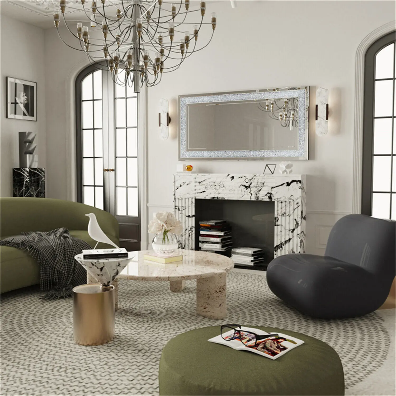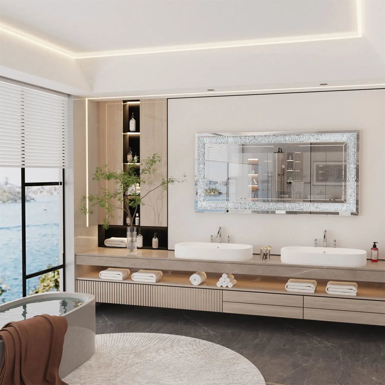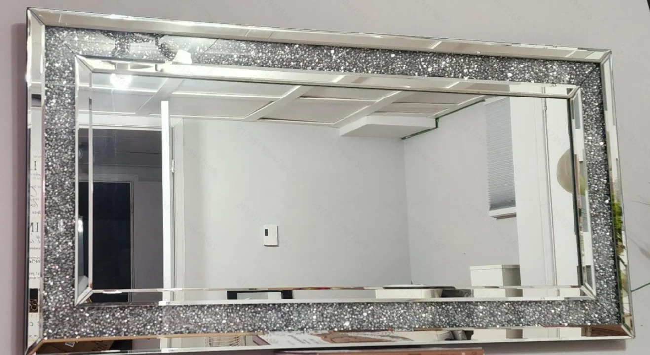 Gorgeous wall mirror decorated with shining crushed diamonds. Elegant decorative wall mirrors bring a touch of luxury to your room. Blend with different style of home decoration styles. Features a large reflective surface that projects light around the room and brightens your home. Suitable for the living room, kitchen, dining room, bathroom, bedroom, hallway, dresser, etc. Made of HD silver mirror, reflect a clear and actual image, giving you the best use experience. Wall-mounted mirror, anti-rust, waterproof,anti-mold. Constructed of 5mm glass,crushed crystal diamonds, and MDF board. 4 reinforced D-Ring hooks on the MDF backboard, easy to hang. Can be installed horizontally and vertically, each way has different aesthetics.